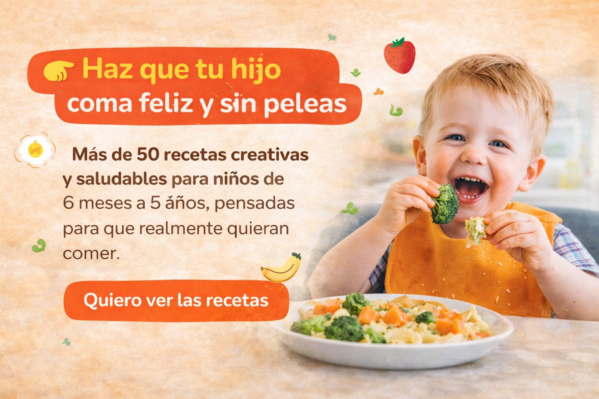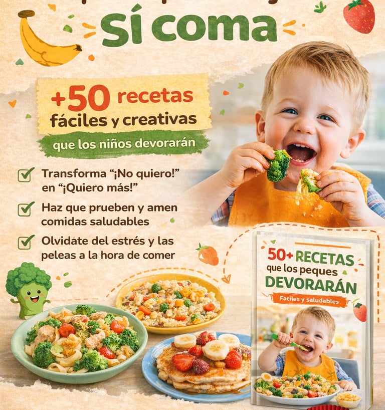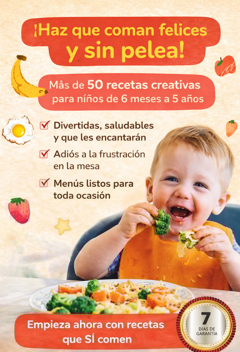 Recetas fáciles, coloridas y adaptadas para niños de 6 meses a 5 años, pensadas para estimular el apetito, reducir el rechazo y transformar la hora de comer en un momento tranquilo y feliz.